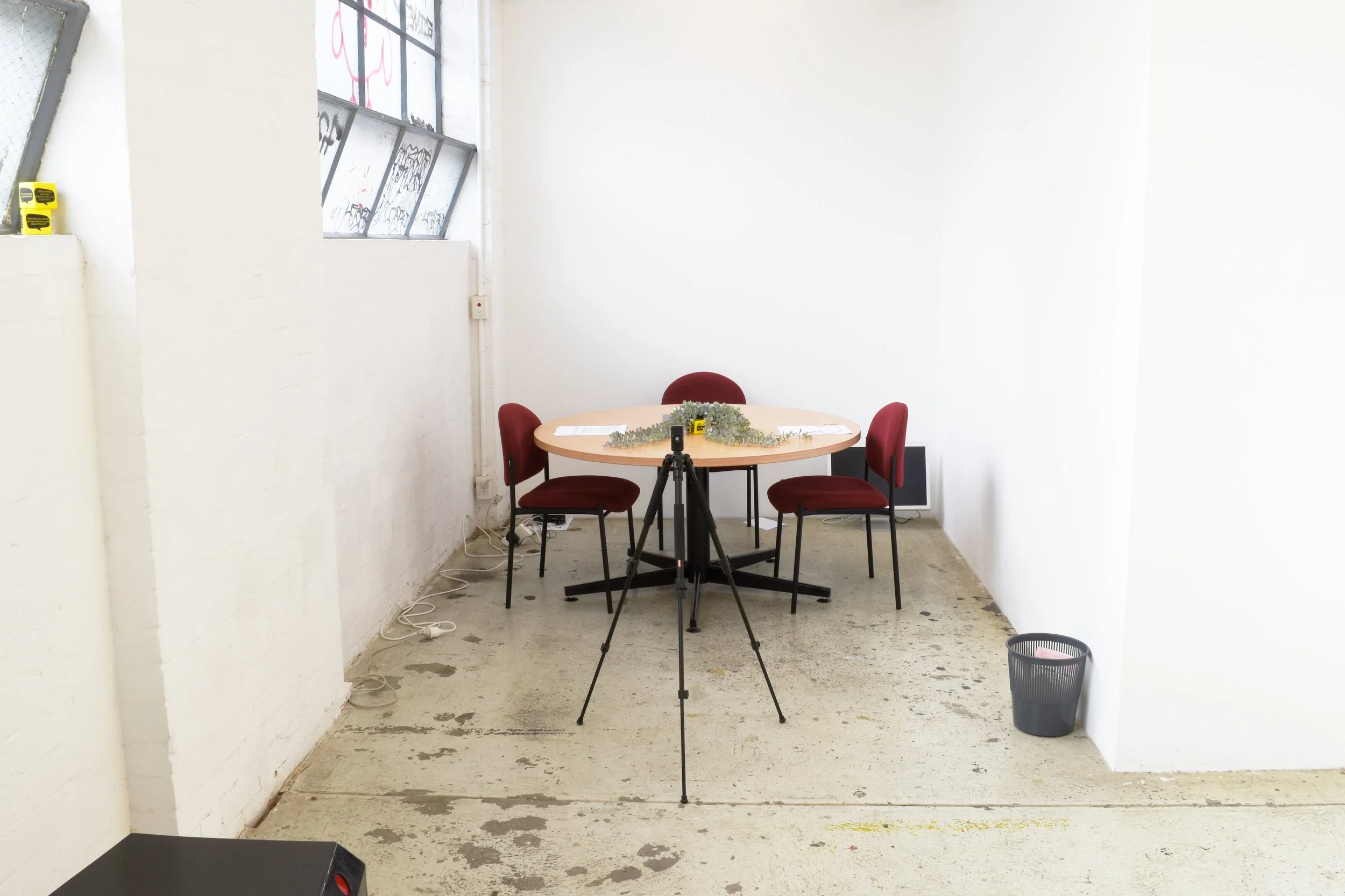 Putting on the headphones, I turned my attention to the main event, the mediation session between two artists “at war.” Featuring Stefa Panoschi and Diego Ramirez curated (and mediated) by Thomas Stoddard, the video is on loop, allowing two viewers at a time to sit in on the session and bear witness. Striking a chord between absurdist humour and achingly real, the video and exhibition descend more into the weird the longer you tune in. I watched the whole thing, noting down line after line. “Stick to politically hesitant formalist sculpture” truly spoke to me, even if it did mystify my parents when I brought it up at dinner later. It wasn’t just the video, but the entire space that demanded your attention to detail. The wry humour extended to the trash, the fake plant, the R U OK Day conversation cube.