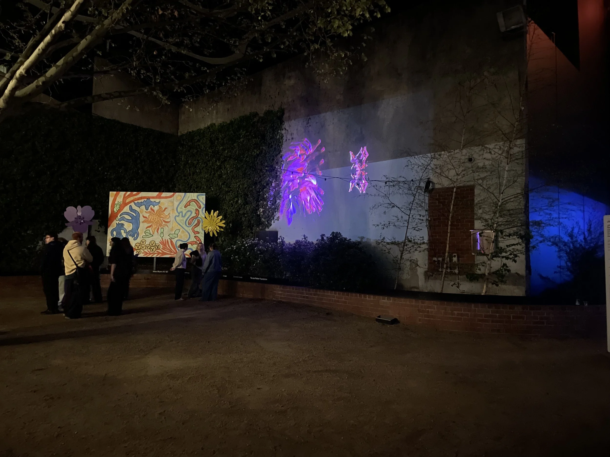 For four nights (and four nights only) Collingwood Yards was the home to Entangled Worlds, a Melbourne Fringe Festival activation by the Centre for Projection Arts. Curated by Yandell Walton, the event put the site into a new light (pun intended). I spent the night looking up, around, and all over in pursuit of the ephemeral artworks. The exhibition put a spotlight on the Centre’s Art Residency program, with all eleven of the featured artists either currently taking part or alumni of the program.