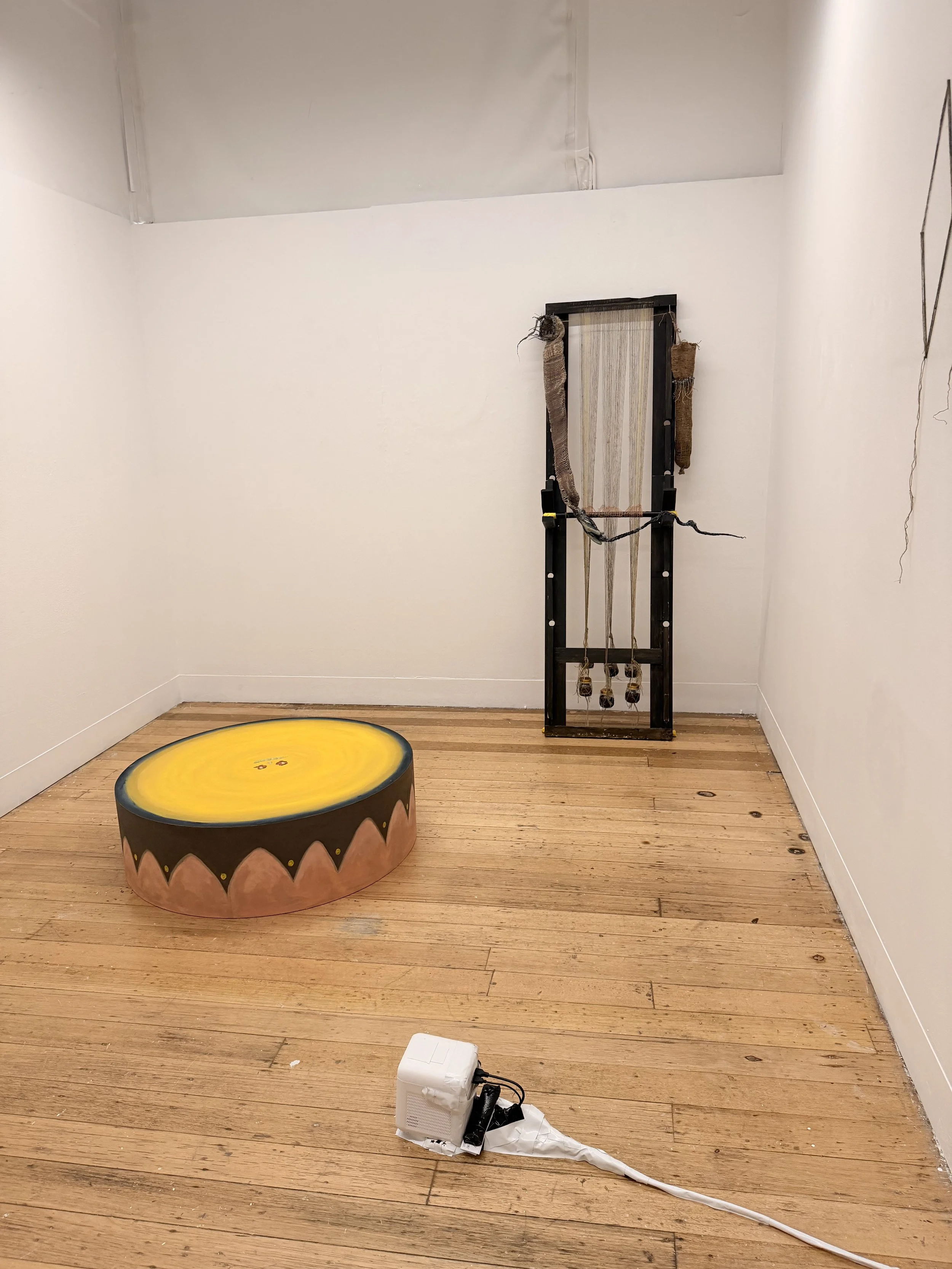 A Costume Without a Carnival, a room of works by Casey Nicholls-Bull was haunting. I will not lie and say I either love or trust clowns- I don’t- or that I’ve been overly fond of the proliferation of clown and harlequin imagery in recent years. Nicholls-Bull turned this on its head. From spindly hands weaving themselves arms and a body, to a jester’s hat with no head to wear it, and a drum waiting to be played, the work created a world, a portrait with no face. Every detail, from the video work to the detailing on the wall and wire based sculpture added dimension, each work in clear conversation with each other and building a world inside the smallest room of the gallery.