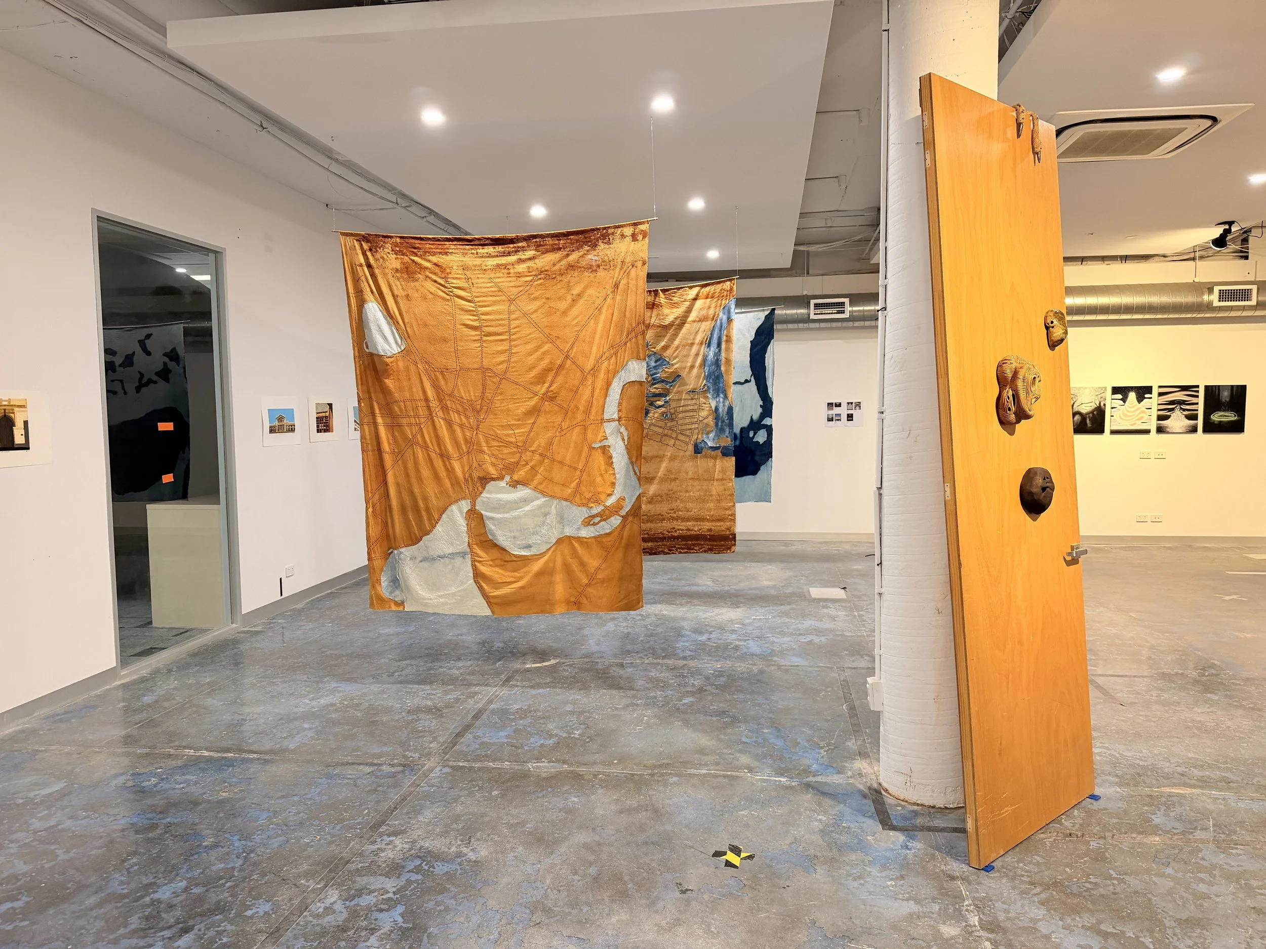 Rebecca Diele’s mohair and paper works pushed textile arts into paper arts, using mohair thread to embroider paper. Diele’s works are a 1960s dream, between the texture of the mohair, the earthy colours and copper, and the geometric designs she plays with. Diele has total control over her practice. Both parts of her showings had me leaning in closer, admiring the precision and planning needed to execute her vision with such exactness. Also in the realm of fabric is Boorloo Bidi. The set of three fabric works by Zali Morgan read like maps, with the prints on the wall nearby as the landmarks they lead to. Without extended explanations or didactics, Morgan weaves her narrative with a clarity that I envy.