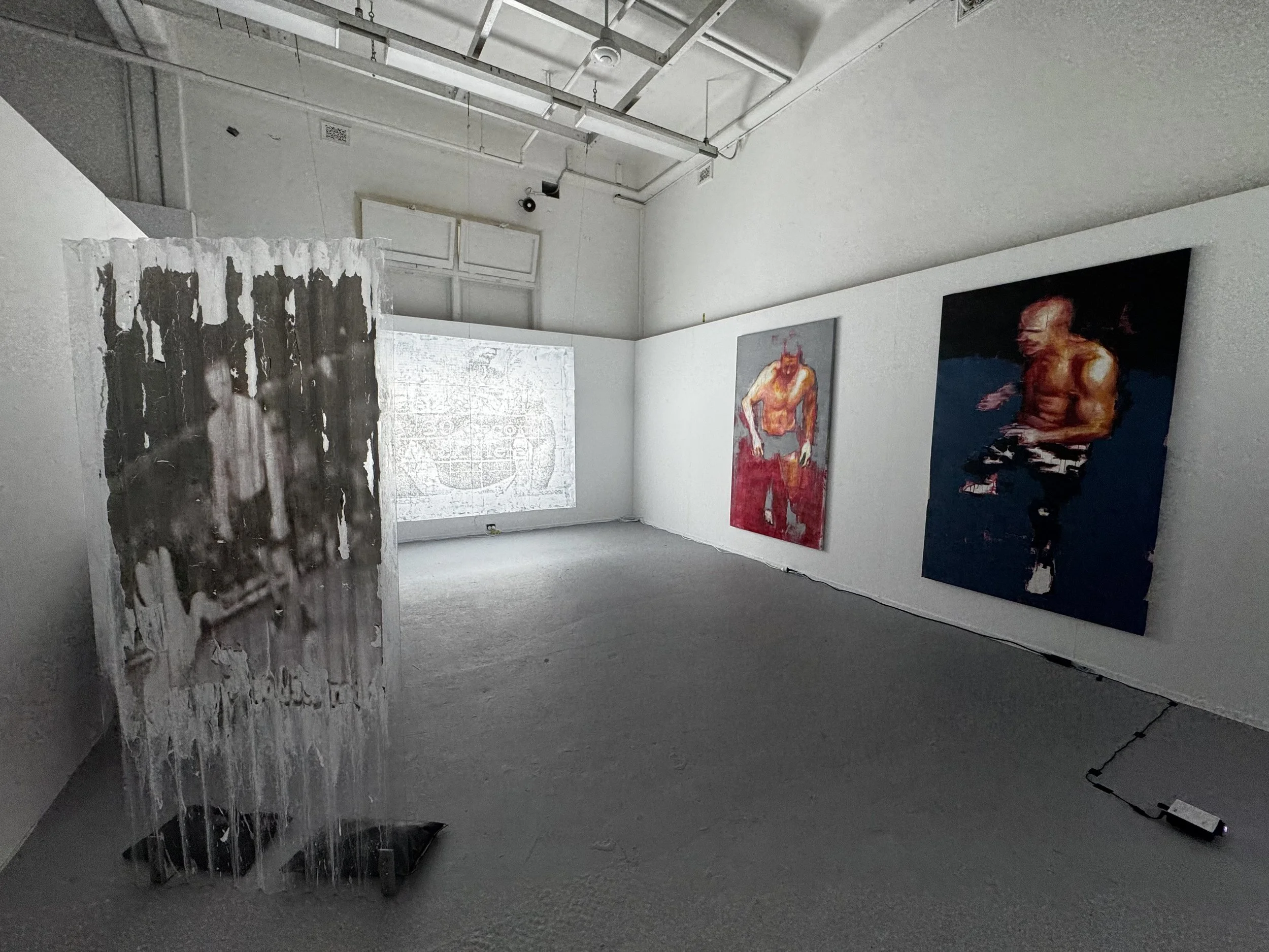Favourites such as Matthew Mifsud’s installation, which strikes me much like the fighters in the imagery do. Mifsud uses the bodies of fighters to play commentary on the degradation of meaning due to the proliferation of screens in our lives. He plays with the line between physical and virtual in Untitled (How Does It Feel?) which sees mismatched A4 pieces of paper glued to a perspex sheet hanging in front of LED panel lights, bringing a pop up spam ad into glaring reality. It’s hard to describe the way Mifsud’s work makes me feel when standing in the space, and I really can’t place what draws me to this installation. I think it’s the combination of the god-like white light that bathes the dark space, and the texture of the paper atop it. Displayed with the pair of paintings, Yōkai I and Yōkai II, whose pixelated blocky, blurred forms feel like snippets from low quality footage, and the staticky CRT TVs stacked on the floor. To me, this installation is the star of the grad show.